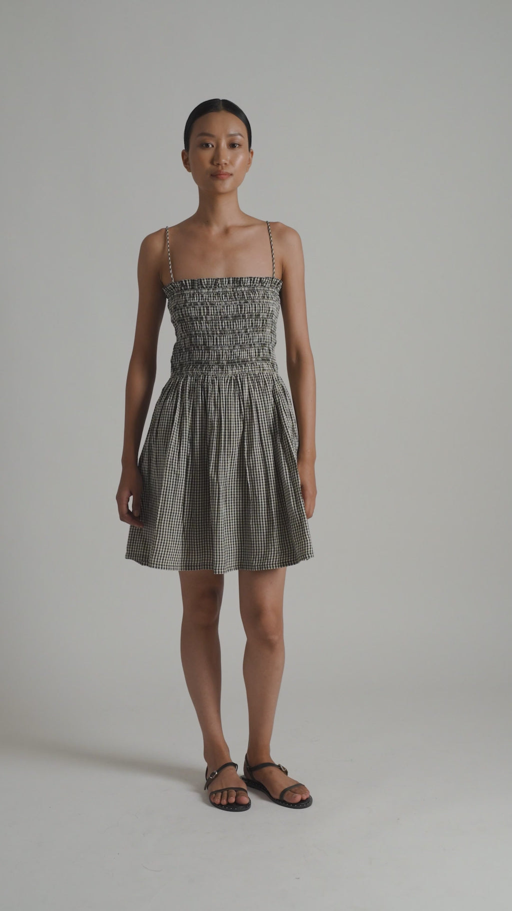 A voluminous mini dress with delicate straps and a smocked bodice, crafted from organic cotton. The dress’s airy shape and side pockets add ease to the simple yet flattering silhouette, making it a perfect blend of style and functionality for any occasion.